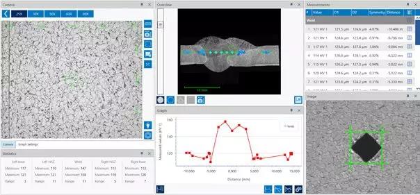 焊接概念 焊接,是一種以加熱、高溫或者高壓的方式接合金屬或其他熱塑性材料如塑料的制造工藝及技術。其物理本質是兩種或兩種以上同種或異種材料通過原子或分子之間的結合和擴散連接成一體的工藝過程。 熱影響區 熔焊時在高溫熱源的作用下,靠近焊縫兩側的一定范圍內發生組織和性能變化的區域稱為“熱影響區”(Heat Affect Zone)。焊接接頭主要是由焊縫和熱影響區兩大部分組成,其間存在一個過渡區,稱為熔合區。因此要保證焊接接頭的質量,使焊縫和熱影響區的組織與性能同時都達到要求。隨著各種高強鋼、不銹鋼、耐熱鋼以及一些特種材料(如鋁合金、鈦合金、鎳合金、復合材料和陶瓷等)在生產中不斷使用,焊接熱影響區存在的問題顯得更加復雜,已成為焊接接頭的薄弱地帶。因此,許多國家的研究工作者對焊接熱影響區的檢測很重視。   焊接檢測-硬度測試 由于焊接中的各種缺陷(見下圖)以及焊縫熱影響區組織的變化,焊接的測試尤為重要。 測量焊縫和熱影響區金屬材料的硬度,并可間接估算材料的強度、比較出接頭各區域的性能差別、區域性偏析和熱影響區的淬硬傾向。     如何進行焊縫測試 為了更細致的理解焊縫微觀組織,通常根據 ISO 9015/15614 進行壓痕硬度測試,測試方法包括使用的載荷、母材、熱影響區和焊縫的位置和數量,以及邊緣距離和壓痕間距。為了滿足標準中規定的要求,需要在布置點位的過程中花費大量的時間。DiaMet 軟件提供的快速而簡單的操作,簡化了測試流程。
