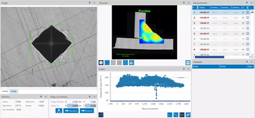 01 程序設置 對于焊接測試而言,我們只需要簡單的填入一些如點數、間距等參數即可完成程序的設置。 02 點位布置 由于焊接工藝的特性,熱影響區的分布以及融合線每次都在變化,這給我們在設置測試點位上增加了很多困難,需要投入大量時間來對測試位置進行分配,但?DiaMet?焊接測試模塊為了我們提供了便利,只需簡單的拖動即可完成布置。 03 專業的報告 報告中可以直觀的看出各個區域的硬度值,同時配以圖示,能快速的了解整個焊接區域的硬度分配情況,以便快速的進行判斷。 ? 同時,在報告中可以加入測試圖片及結果,可以更加清晰的看到組織和測試壓痕。 04 Mapping 功能 DiaMet 不僅能很大的提高焊接測試的效率與準確性,還可以進一步展示焊接區域的硬度分布,幫助使用者進行數據分析。 Mapping 按如下顯示: