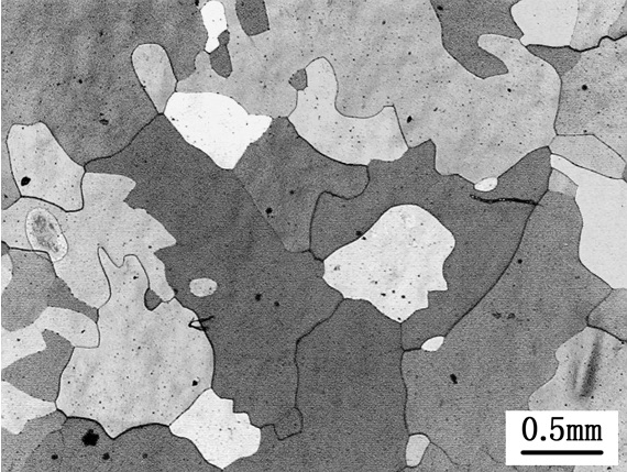 在偏振光下研究金相組織,一般只需拋光而不需侵蝕便可獲得清晰,真實的組織。下面列舉其應用: 1、組織與晶粒的顯示 各向異性的多晶體,其晶粒在正交偏振光下可看到不同亮度。亮度不同表征晶粒位向的差別。具有相同亮度的兩個晶粒,有相同的位向。 2、多相合金的相分析 兩相合金中一相為各向同性,另一相為各向異性,很容易由偏振光鑒別。 兩相均為各向同性。經適當的化學侵蝕后,使一相被侵蝕后具有光學各向異性,而對另一相不發生侵蝕作用。 3、非金屬夾雜物鑒別 在正交偏振光下透明加雜物將有不同的反射規律。 ① 各向同性不透明夾雜物反射光仍為線偏振光。正交偏振光下呈黑暗一片,轉動載物臺一周無明暗變化。如FeO夾雜即屬此類。 ② 各向異性不透明夾雜物在線偏振光照射下將發生振動面的旋轉,使反射偏振光檢偏鏡改變正交位置,部分光線可通過檢偏鏡。轉動載物臺一周觀察到四次明亮,四次消光。如鋼中FeS夾雜可觀察到這一現象。 ③ 各向同性透明夾雜物在正交偏振光下可觀察到與暗視場相同的顏色(體色)。如MnO,具有各向同性,正交偏振光下與暗場下觀察到相同的顏色—綠色。 ④ 各向異性透明夾雜物在正交偏振光下可觀察到包括體色和表色組成的色彩。如鈦鐵礦(FeO·TiO2),三角晶系,各向異性,暗場下薄層時透明,呈玫瑰色或褐色等。偏光下呈閃耀明亮的玫瑰色。 ⑤ 透明球形夾雜物除可顯示透明度及色彩外,還可看到黑十字效應及等色環。如球狀玻璃質的SiO2夾雜。 4、范性變形,擇優取向及晶粒位向的確定 如果多晶體金屬受外界條件的影響,晶粒以要位向排列起來,例如范性變形后,或范性變形再結晶后晶粒的擇優取向(即變形織構或再結晶織構),由于多晶體位向的一致排列,在同一金屬磨面上將有一致的光軸位向,因此,正交偏振光下整個視閾內明暗程度應趨于一致,近于單晶體的偏振效果。或整個視閾明亮,或整個視閾黑暗。 變形鋁合金、鑄造鋁合金在檢驗金相組織時用通常的混合酸(Keller′s試劑)很難顯露晶粒邊界,同時,在明場條件下觀察,組織襯度也不好。