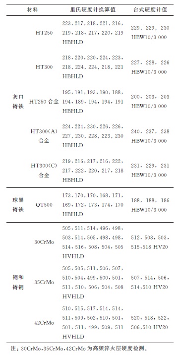 1.3?檢測結果 根據GB/T 17394.1—2014的要求,里氏硬度試驗應至少進行3次,并計算其算數平均值。如果硬度相差超過20HL,應增加試驗次數,并計算算術平均值。 沒有將里氏硬度檢測結果換算成其他硬度的準確且普遍適用的方法,除非通過對比試驗得到相關的換算依據,否則應盡量避免里氏硬度換算。當應該進行換算時,對于常用金屬材料可參照GB/T 17394.4—2014進行換算。 在里氏硬度符號前示出硬度數值,在后面示出沖擊裝置類型,如600 HLD。對于里氏硬度換算其他硬度的標識,GB/T 17394.1—2014中沒有明確規定,通常在里氏硬度符號之前給出相應的硬度符號,如600 HBHLD。 2 里氏硬度計的校準 2.1 校準條件 被校準材料應該取自試樣基體或熱處理條件相同的同牌號試樣,試樣需加工成?100mm、厚度55mm的圓形樣塊。校準面與支撐面需保證平行度不大于0.1mm,校準面Ra不大于0.8μm;支撐面Ra不大于1.6μm。G型硬度計校準試樣質量需大于15kg。 2.2 校準方法 按GB/T 17394.4—2014的技術要求進行里氏硬度檢測,取15個點的算數平均值作為里氏硬度計檢測值用于校準,根據實際情況可減少檢測點。以相關洛氏、布氏、維氏等硬度標尺的標準試驗方法進行被校準物檢測,并至少檢測4點,取算數平均值為檢測值。計算兩次檢測結果算數平均值之間的偏差可得到補償值,即補償值(偏差值)等于標準硬度算數平均值減去里氏硬度算數平均值。 2.3 校準結果 研究人員將從事現場檢測遇到的材料校準匯總于表4,包括灰口鑄鐵、球墨鑄鐵、高頻淬火件等檢測結果的對比。